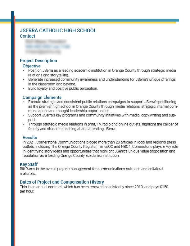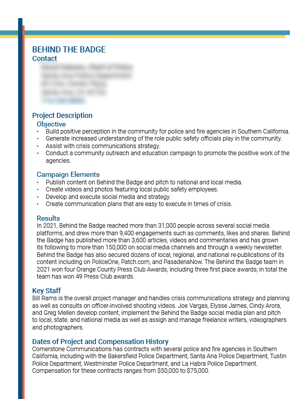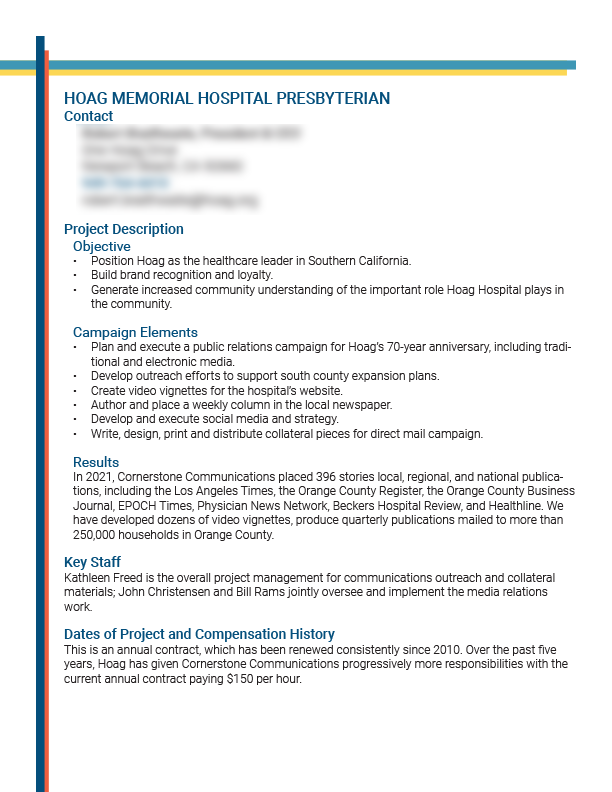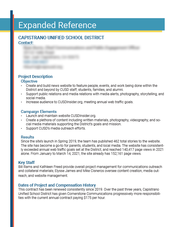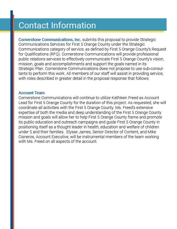 One of my former editors from the Orange County Register, Mike Cisneros reached out to me to help his team at Cornerstone Communications knock out this RFQ document for them with an incredibly short turnaround time of only a couple days, I scratch-built this design using the client(First 5 OC)'s existing style guide as a starting point. This project primarily consisted of layout and typography, but involved a lot of fine-tuning to fit all the provided content from Cornerstone Communications.